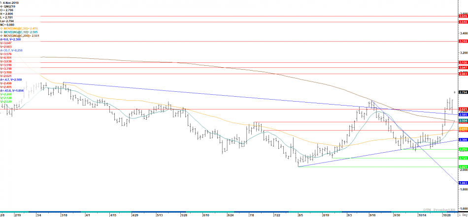 Price rallied at the end of last Friday which leads me to believe something changed in forecasts. All I know is significant resistance areas got pierced in rather easy fashion up to the Sept high of $2.71. Early trade on Sunday has that level taken out but I want to see it on a close. They market is over-bought but in a short covering rally (warned you about that a week ago with a picture) technical levels of resistance are somewhat useless. If you are short — well you were warned- if you are long —remember that rallies based on short covering are not long for life. Continue to monitor open interest and if it starts to increase when prices increase — watch out.