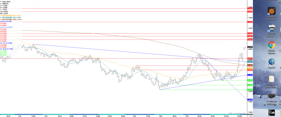 Prices gapped above the resistance around $2.72 on the open Sunday night and never even tried to close the gap— guess we have run out of natural gas. What was interesting in the trade yesterday was prices immediately raced to the highs of the general session only to wander about. That is not the price action of additional short covering above resistance at $2.72, I would of expected prices to rally up to the $2.90 zone quickly and perhaps they will. From a tech perspective the market is over bought and should need to digest the gains for a longer term rally into the Q4 (but you never know about a short covering rally). This run is all short covering based upon near term weather forecasts is what I hear. Have no ability to judge the accuracy of statements.