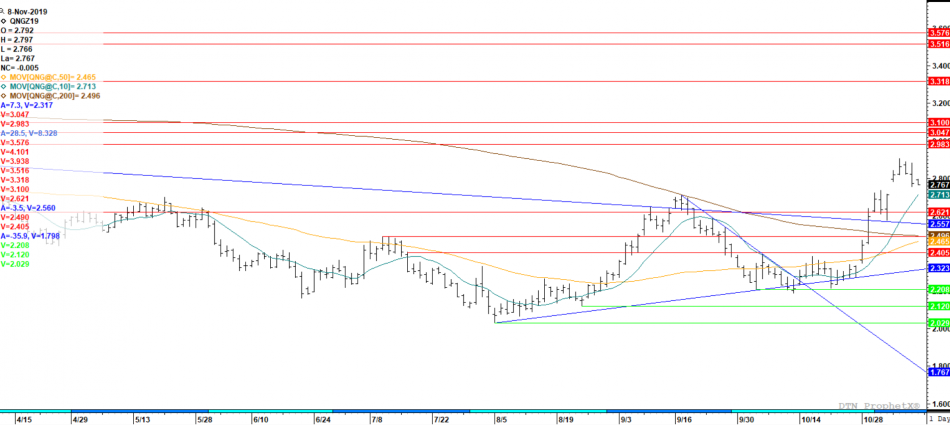 The new mini-range was challenged yesterday on the bullish storage report that turned bearish. Still expect probes lower and perhaps close the gap from Monday at $2.718. Perhaps consolidation is the trade right now.