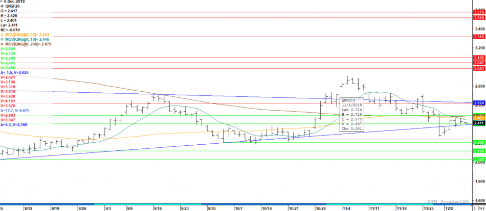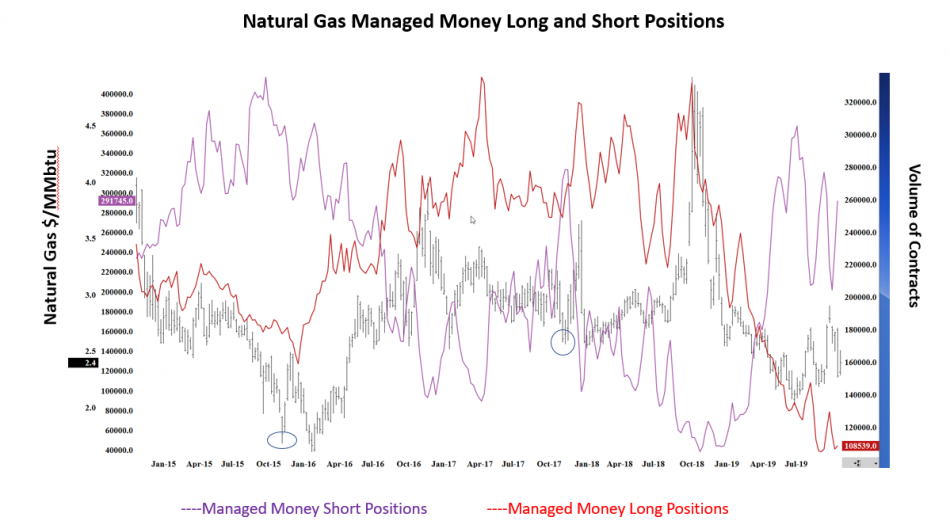 Mentioned earlier about the perilous nature of shorting the winter in December — so I went back and produced the chart above. The Commitment of Traders Report (CFTC) is released each Friday representing position of the Tuesday of the same week and it shows the Managed Money (speculative) short and long positions at that time. Looking at the Speculative Short Position chart above notice the two blue circles at the lows in Dec ‘15 and the lows in Dec ‘17 and what happened to the short position (volume of contracts purple line – right axis)when some event (likely a weather forecast change) forced the shorts to cover. In Dec ‘15 it was an $.80 gain (nearly 50%) and in 2017 it was a $1.00 gain. I bring this to your attention not suggesting it will occur this year but as I mentioned earlier this week you have to be very nimble shorting an early winter market. Each of those years had supportive fundamental data for the declines (just as this year) but when the forecasts changes — everything changes. Have fun be nimble.
