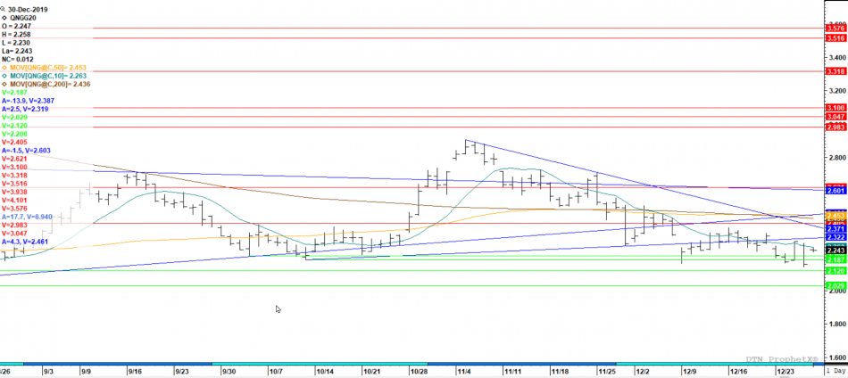 Welcome to 2020 and the same range that has held prices for the last month ($2.138-$2.37). The declines held support last week and early trade has them holding currently. Early January trade has occasionally had and impact on trade(highs and lows) during the year and I will aluminate more on that history during the week. Until there is directional bias out of the range — play the range. BTW the CFTC report came out on Monday and showed the speculative short crowd adding to positions through the report date of December 24th.