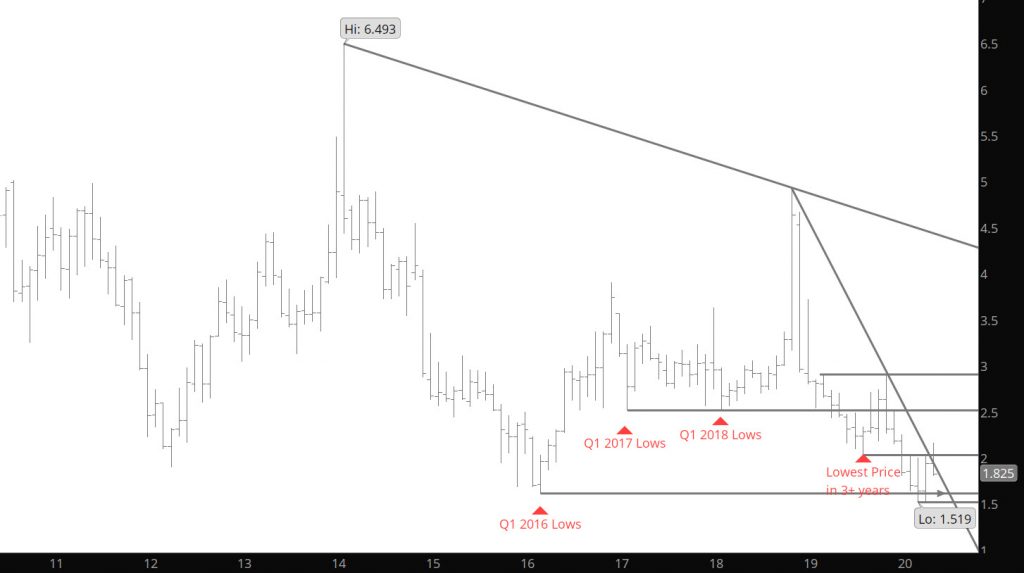 What can you say about a market that test the 200 day SMA and the 40 week SMA all on the same day and then promptly reverses lower to close the week with a lower low breaking the recent trend activity. I can tell you one thing you can’t say is bullish. That being said, each progressive day the declines were on lighter volume — not exactly the bearish indication that bearish folks would want to witness. Through Tuesday (the latest CFTC report on Friday) showed additional speculative fund covering positions and open interest was down for the week (very slightly). I had seen the press that funds had come in on the declines, which, from the data is not supportive of that type of claim.