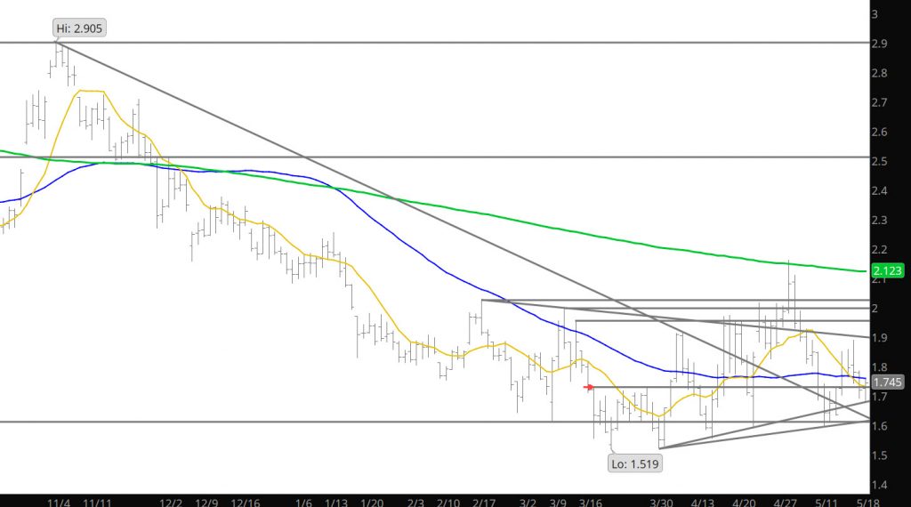 Went into the historical aspect of this expiration, Holiday weakness and what to expect early in June on the web site. It is part of your subscription so when you get a chance during the day — bring it up. In terms of today and tomorrow (expiration), going out on a limb that June will settle with in a few pennies of where May expired ($1.794). Why– nothing has changed in the technical world except for the break out (on web site), but the collapse in prices, after, mitigated that move. Here we sit. All that an be traded on is the range until the market chooses to tell you where its next movement is.