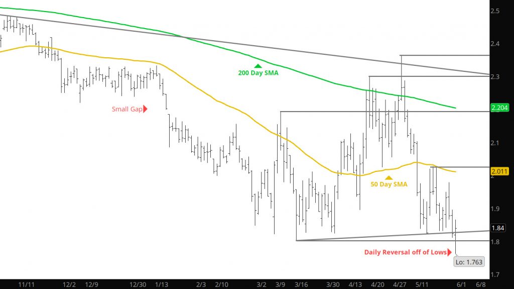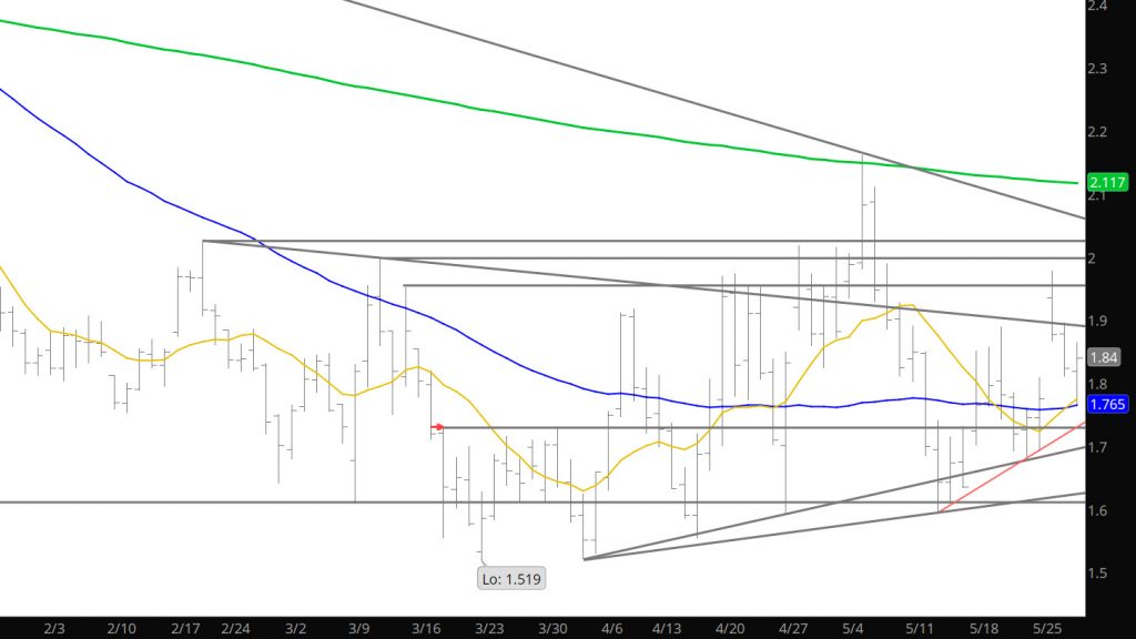 For the last ten trade days, the market has traded in the range between $1.68 and $1.98 after exploding up to $2.16 before capitulating down to $1.595. Even with the expansion of the range some interesting trends for prices are explained on the web site and encourage all to find 15 minutes to review. With the close on Friday, prices now sit in the middle of the narrow ten day range. Pick your poison.