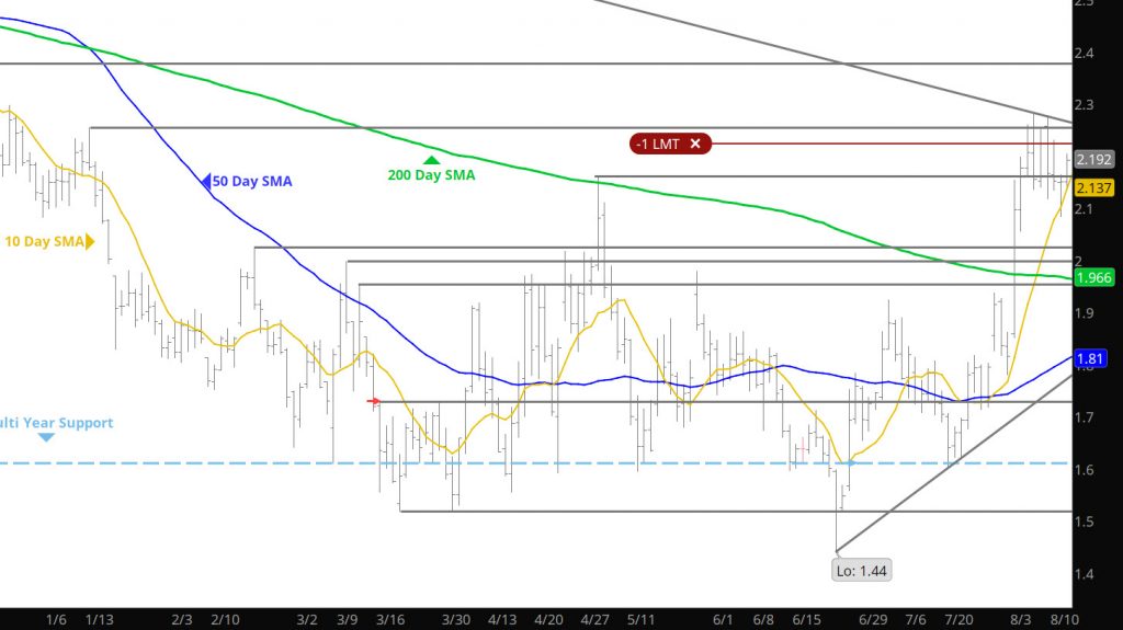 Was expecting more of a test of support with a slightly bearish report. Instead, prices rallied at the end of the day. Perhaps this is the new range $2.08-$2.28 but I believe that there will be another test of support before the expiration, but this expectation is solely based upon the historical trend of prices during this time of year. Am not suggesting that the $2.05 level will break down, rather that the highs for the September contract are likely established and the lows between $2.02-$2.055 will hold going into expiration.