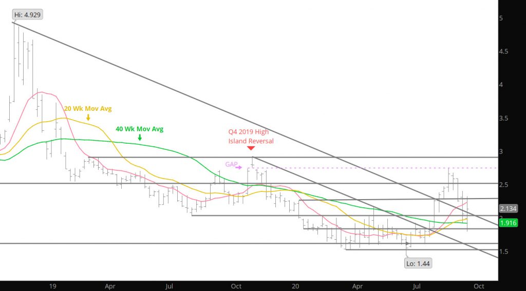A wild week for gas prices as prices started weak and tested the lows from late July, trading down to $1.795, then finding support and rallying prices back up to the initial support from the collapse the week before at $2.275. While prices pushed above that level briefly, they settled the week backing off.
