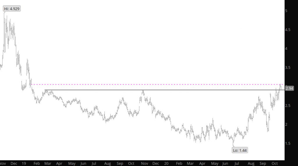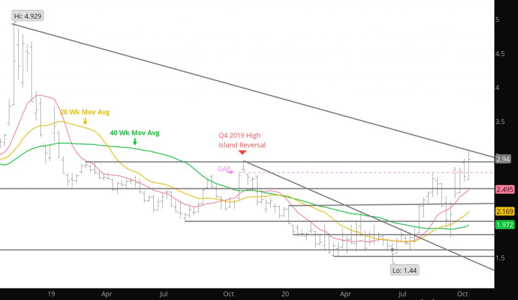 Technical behavior interprets higher weekly closes and breakouts through well – defined resistance (held the market since 2019) are bullish indications that a market intends to continue higher. Unfortunately, the breakout to a new high was not supported in the immediate or differed contracts, November was the only contract of the next nine to record a weekly gain. A highlighted earlier, technical orthodoxy requires confirmation, perhaps it runs a little more during the three expiration, but I would expect December to continue to weaken as highlighted last week.