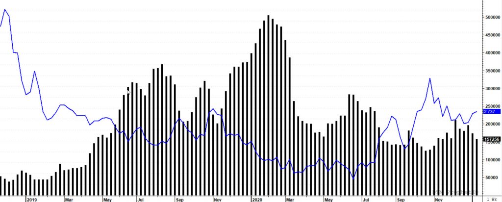 Last week’s close occurred with an increase in weekly volume but additional declines in open interest. The chart above shows the open interest declines occurred partially from the speculative interests leaving the market. It is interesting that the speculative length entering the market offset the losses from the shorts leaving the market. For the market to achieve significant gains the open interest will have to start gaining as well as maintaining the gains in volume.