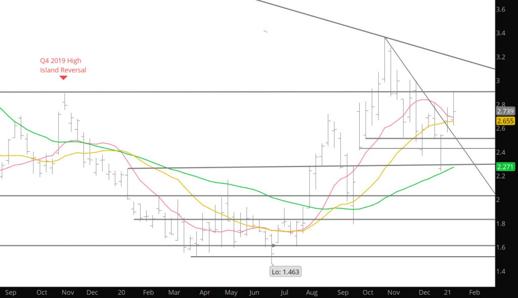 The weekly chart above shows the weekly reversal from the December low followed by a gap higher to begin ’21; the two weekly closes above the trend line declining from the October high and December high; and this week a close above the ten week SMA. While these actions could lead to a bullish bias to trade, still expect another test of support and the area around $2.60 has become a well defined area for initial support. From there the gap between $2.566 and $2.547 which still exists in the Daily and Weekly charts.