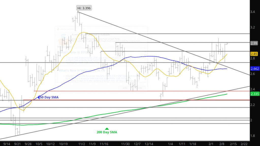 Was beginning to wonder if the market was suffering from “buy the rumor sell the fact” as prices could not gain any traction. Yesterday, and early trade today has confirmed that the cold weather patterns will have an impact on demand. Now the question remains does the fundamental data points have the strength to trade above and CLOSE above major resistance between $3.00 and $3.05. If we get the same decline at resistance on the close that we witnessed twice before then nothing has changed and the market remains range bound near term. Otherwise it gets interesting.