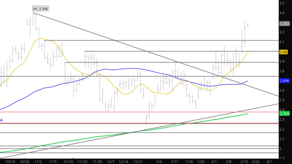 Support:$2.98-$3.05,$2.373–$2.356,$2.255-$2.176 Minor Support:$3.108, $2.806, $2.71, $2.60-$2.554,$2.483, $2.162 Major Resistance: $3.316-$$3.396, $3.486 Minor Resistance:$3.172