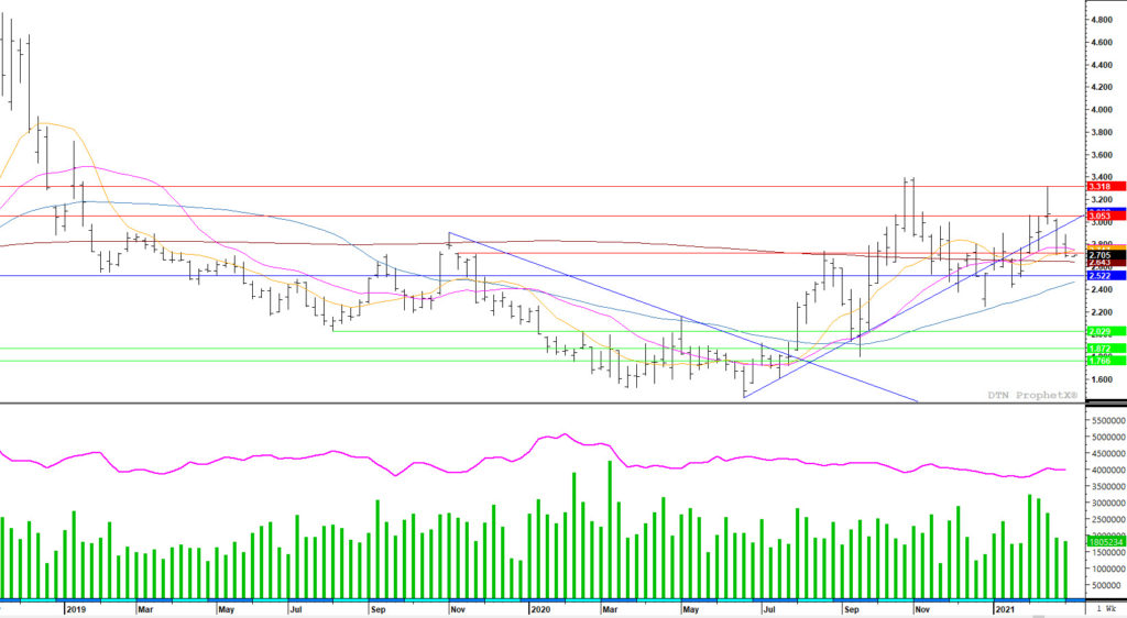 Have discussed in the Daily about the market wanting to test and eventually define the low end of the range trade that will develop (it has for the last few months). Last week was a start to develop a low — not sure it is over as technical points to further declines. Prices have now set two consecutive weeks of lower closes which is bearish but the declines of those weeks have occurred on much lower volume and declining open interest. Looking at the chart below — significant volume and open interest characteristics in this weekly continuation chart shows the volume spike that accompanied trade through the December – January highs, but perhaps more important the change in open interest. Total open interest had steadily declined since early November (nine of ten weeks) but then increased for three straight as prompt gas rallied. Increasing average daily volume and open interest along with price is a substantial technical positive. During the price weakness of the last two weeks both declined.