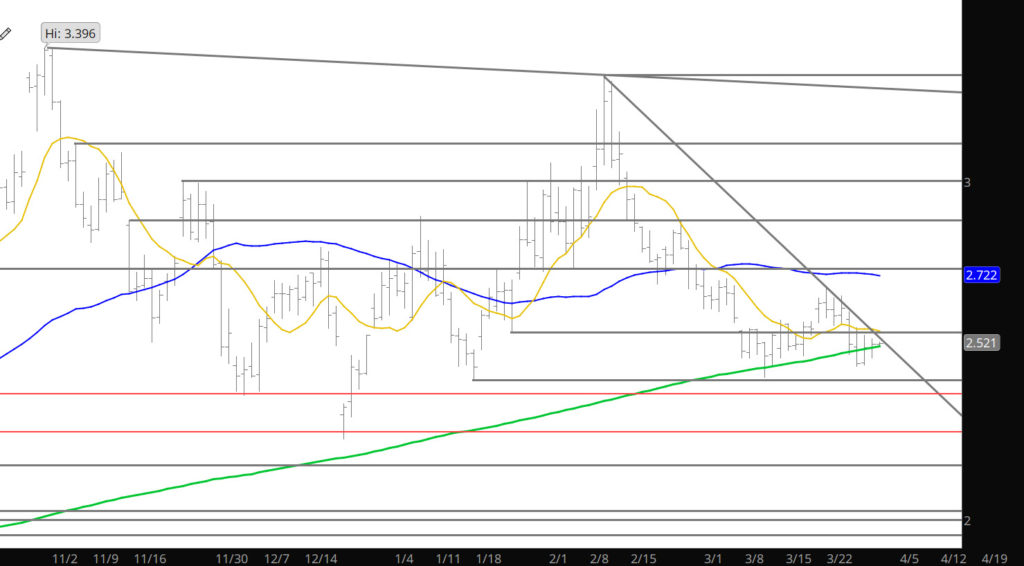 Interesting that the volume rose a little yesterday as the prices held firm on the storage release that was well within expectations. This market has been consolidating for nearly two months (though within different ranges) with open interest very close (within 4,000 contracts) to where it was on March 8th. Volume has had some good days and some terrible days and yesterday’s volume was the third largest since March 8th. What to do — patience and buy the dips with tight stops as I mentioned earlier in the week. It is not conclusive that this market has the commitment to do diddly.