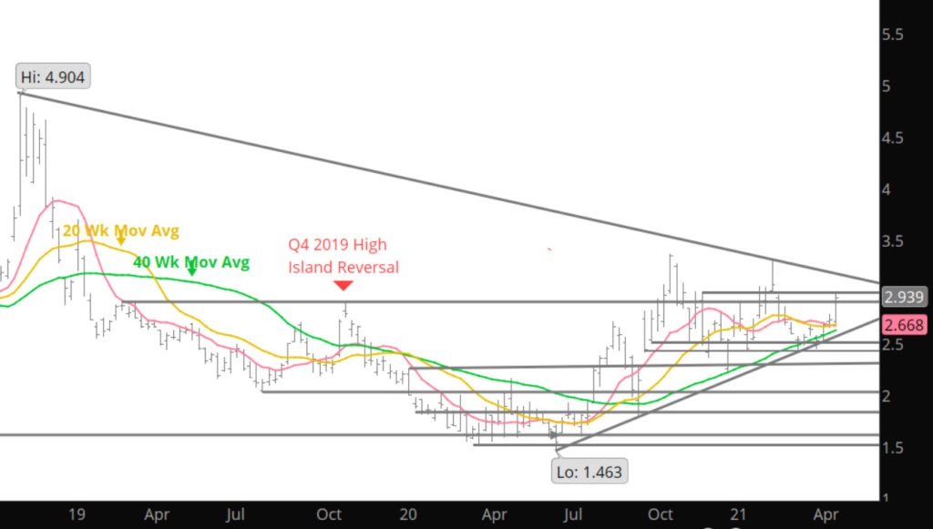 Market internals show last week’s volume basically flat to the previous week and both of the last two week’s volume down from earlier in April. For an extension of the rally beyond $3.00, the bulls would like to have volume increasing as prices have gained in the last two weeks. Momentum indications (Daily and Weekly RSI being lagging indicators) are reaching the higher side of the range but are not over-bought. The weekly Bollinger band analysis also confirms that the trade is likely near the top end of the new range but prices could work another dime higher before signalling potential issues.