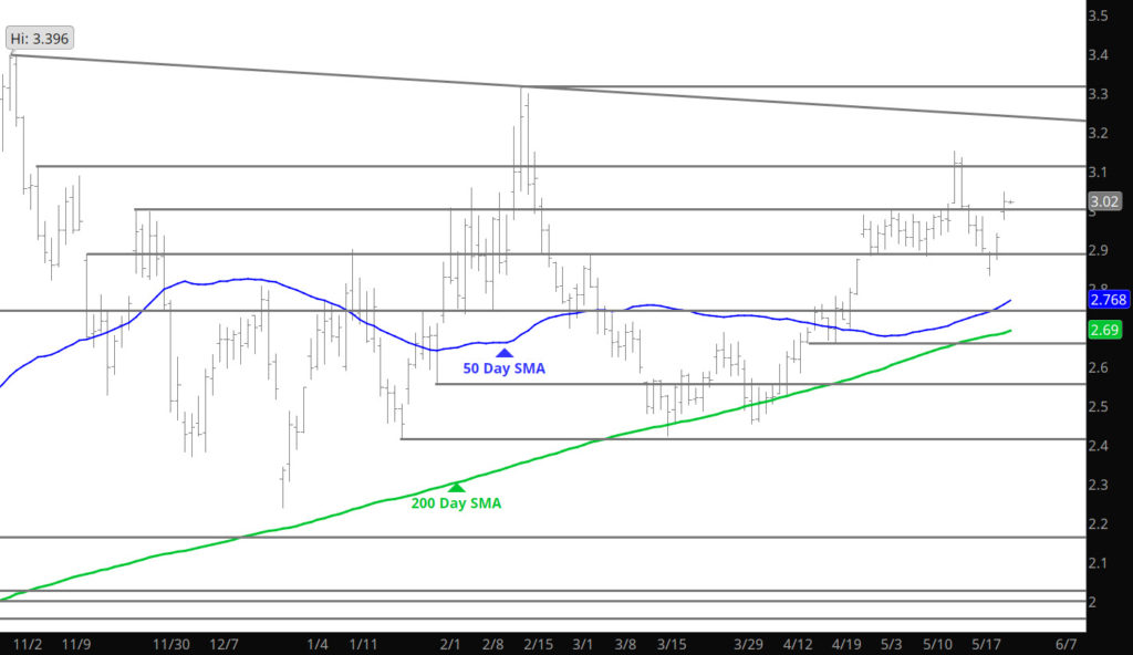 Jun expired on the higher side of the range and July quickly traded into the June expiration range. There remains a nickle spread between Jun and Jul and would expect a retracement into that range. The July chart looks more supportive than any of the recent monthly charts and will go into that on the weekend. For now — play the range– and have a great weekend as I will not be publishing a Daily on Friday.