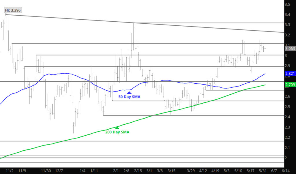 Prices finished the week with a new high weekly close for the July contract and did so with higher open interest and supporting volume supporting the gain in price. This activity is presumed bullish, but July faces an array of formidable and well – defined resistance. The highs of week ending 05/24 (the May high), the high of the past week and the May high of July gas (3.204) are nearly or greater than two standard deviations above the 20 – week SMA. Additionally, prompt gas has historically felt the weight of seasonal pressure during the first couple of weeks of June (historically around the holiday), however, this year the weakness was prior to the holiday. This will need to be defined in the coming week.