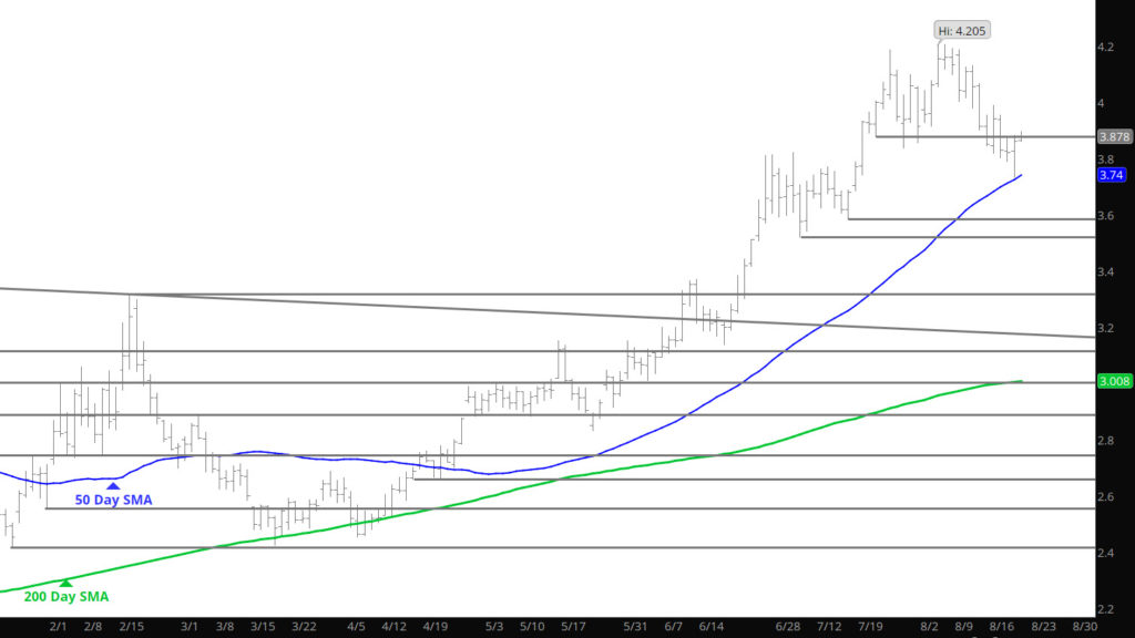 Not sure what piece of news stimulated the late morning run in prices but the reason is meaningless. The facts are the market is behaving just the way it should after breaking through support earlier. Support has been tested now the prices should test resistance, but the question is where will the test occur– at the high end of the recent range ($4.02) or somewhere in the $3.90’s. It should happen this week.