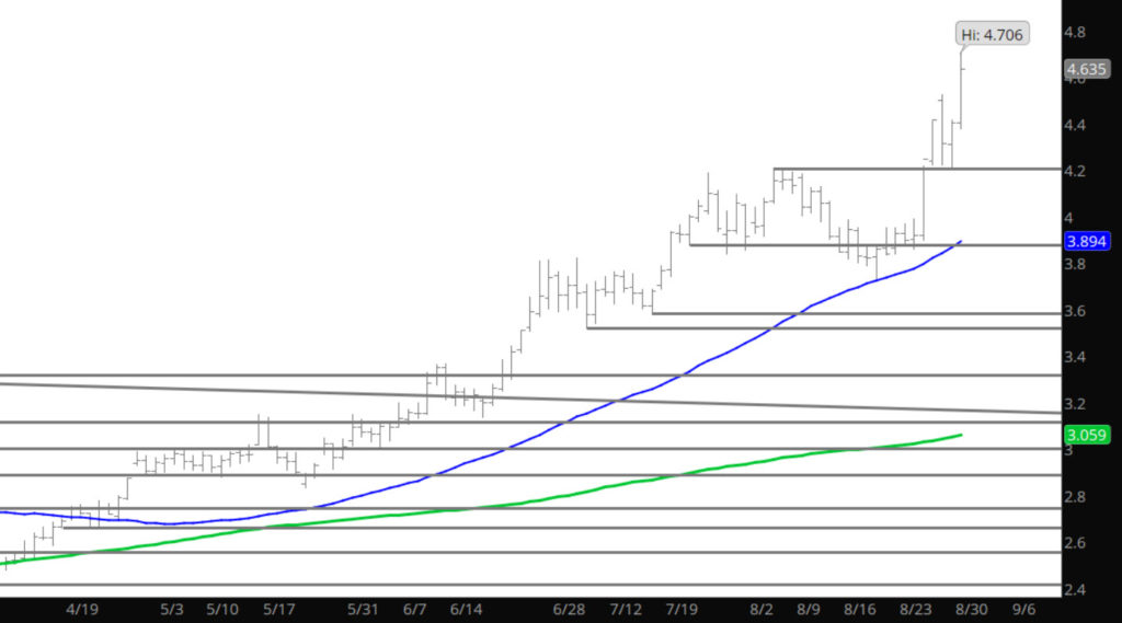 Discussed yesterday the old adage “if markets don’t go down when there supposed to, then they will go up”– no doubt about that yesterday. The third quarter low is likely in and similar to last year it was in early July, off of the Independence day weakness. We are now entering another period of historical seasonal weakness (either side of the Labor Day weekend)– but not expecting a major correction like last year (nearly a dollar decline from Aug 28th to Sept 21st). Will discuss the target for the declines later in the week or over the weekend. Want to evaluate the weekly charts on volume, open interest, and the Bollinger bands after this week’s continuation of the break out that started last week.