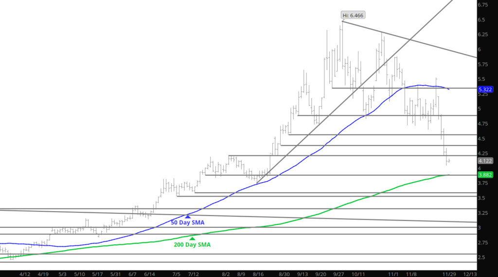 Decided to add the Weekly continuation (below) chart to give an idea of what the declines are looking for. I would expect that a continuation of weakness below $4.00 will find some liquidation covering (stops) that send prices down an additional $.03-$.05– but the real target is likely the 40 week SMA (close to the 200 day SMA) at $3.90 which has held the market since Sept ’20. A break below that will have serious technical implications. In the near term the market is now starting to approach the extreme zones on the momentum indicators (Daily RSI) but could test the $4.00 before entering the extreme zone. The market seems to be looking for the low end of the new range and perhaps today will give us a better indication.