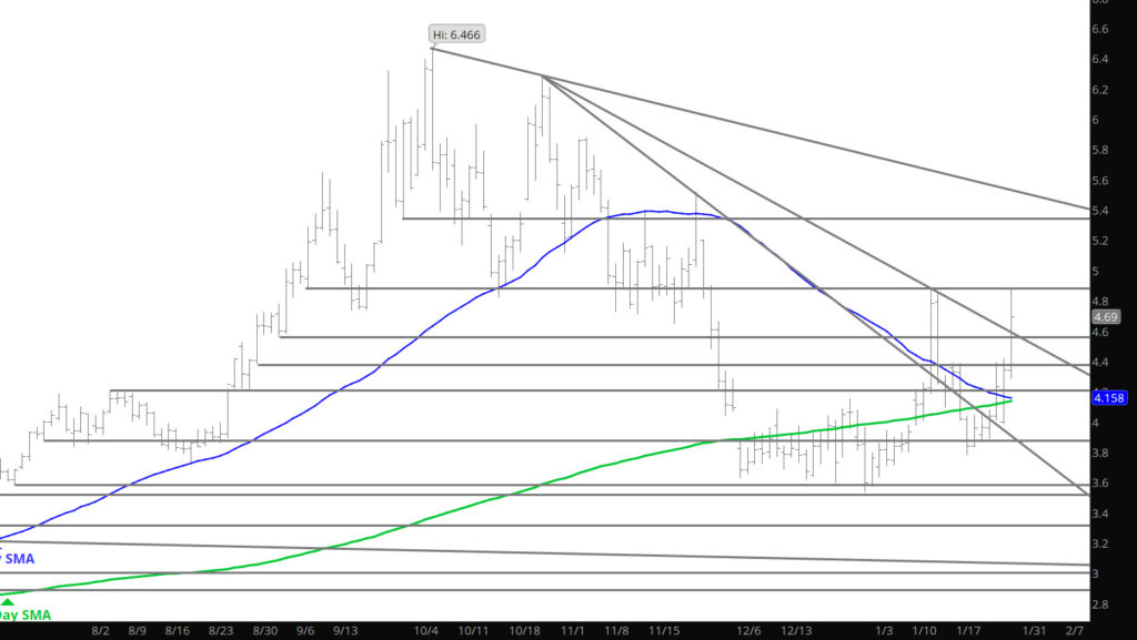 Explained in the Weekly section about an issue with my charting software and not being able to chart the run on the expiration day of Feb gas. Will look to correct this week. Regardless of charting software– the market did not give up the gains in Mar gas and the open on Sunday night confirmed the strength on Friday. The Weekly section discusses the history of Mar gas after Feb expiration and trading in early February and recommend reading as it highlights what to expect this week. Due to the volatility around the expiration and Sunday night– I will be sidelined until the market has a chance to define its new ranges — that said it seems that the bullish bias to trade is back and that dips will likely be bought.
