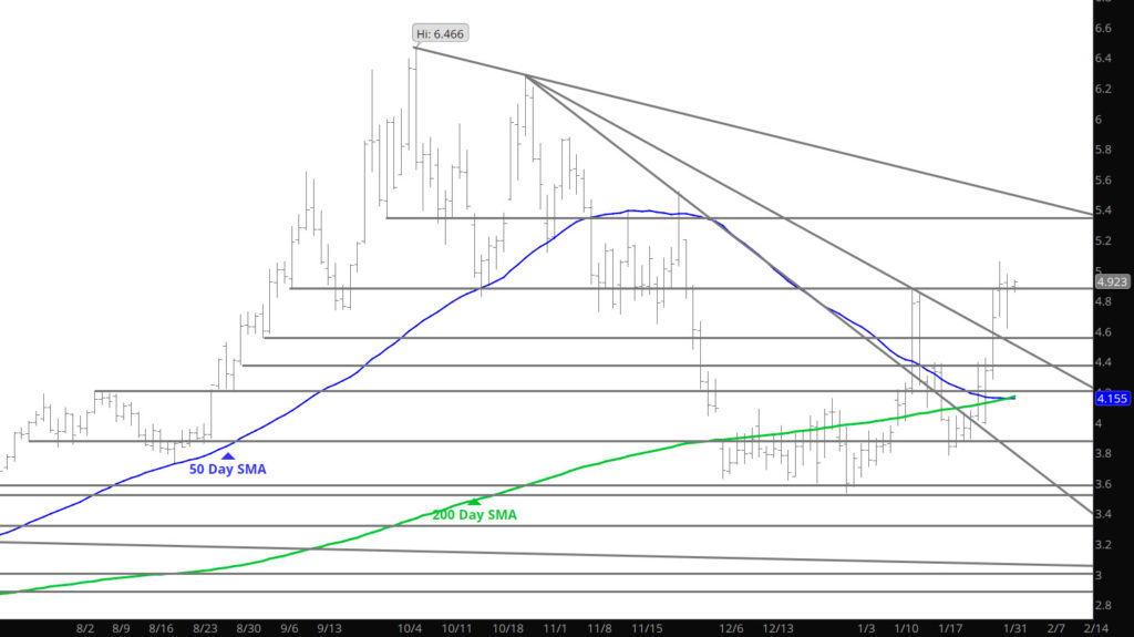 Range Developing February 2, 2022February 1, 2022Daily ContinuousPrices expanded the range a little lower before recovering and rallying as the day went along. This is still a developing range trade and patience during the week would be the best suggestion after last weeks small explosion on expiration. Major Support: $4.19-$4.186, $3.734, $3.63, $3.584-$3.522Minor Support: $4.73, $4.52, $4.38Major Resistance: $4.876, $5.088, $5.81To read The Daily Call you must be a subscriber (Current members sign in here. ) Start your subscription today.