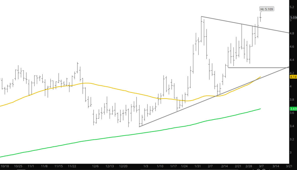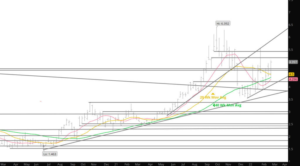 Remembering my high school Latin class (don’t ask me why) this word is used to define a long period of time which is the long period (nearly 2 years) that the gas market has been with a bullish bias. For the second time in two weeks prompt gas (the first being the last week of the March contract followed by the April), tested the intermediate – term defining 40 – week SMA at $4.42. A reversal from the support found on the April chart and the continuation moving average triggered a rally and a test of its February high (5.045 v 5.053, see chart below).