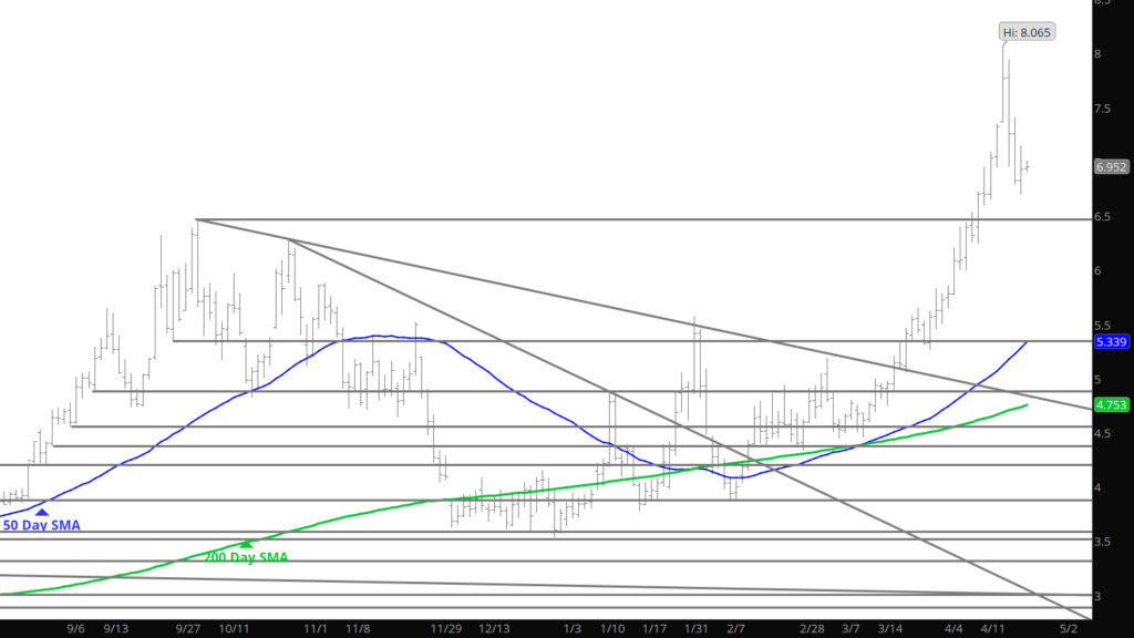 Discussed yesterday about the potential for consolidation and we got a taste of it when the storage report came out and prices fell to just above $6.70 only to spend the remainder of the day working back higher. We are reaching the May expiration and while last month showed significant gains from the 24th until the 28th (falling at the end), the trend continues to show well-bid expiration’s. Would expect that trend to continue until it doesn’t. The action from yesterday confirms my belief that the market is still well supported even with the $1.00+ decline from earlier highs.