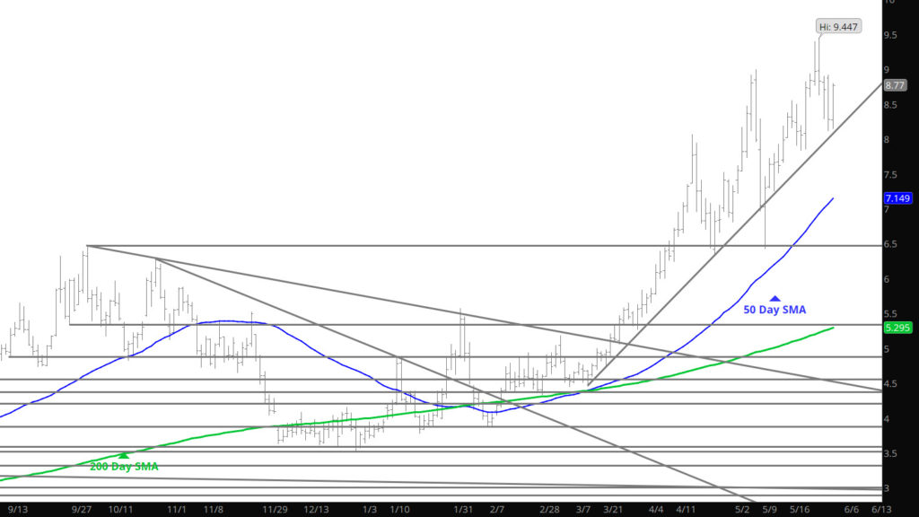 Not even a hard test of the support line drawn from the March, April and May low of continuous prices– but prices rallied significantly off of the weak test, creating a near term support for the monthly range. Suspect prices to rally up to the $9.00 area (early May high)– not convinced it will chase the calendar May high, created during expiration.