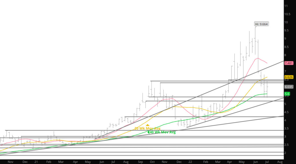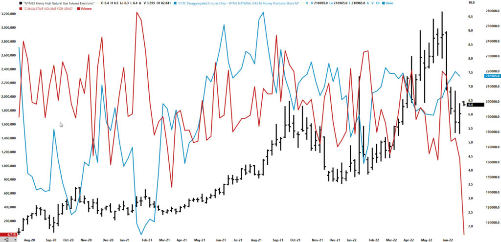 That said, the gas market traded a rare “outside” month during calendar June (the last one of those was during September ’20) which inflicted a lot of technical issues to the charts. Time will be required to repair the issues and there are a lot of trapped late coming bulls between +/- $5.50 and $9.50. Many of them will be elated to exit those positions anywhere near breakeven. Expect rallies to find some sellers at the beginning of this potential rebound.