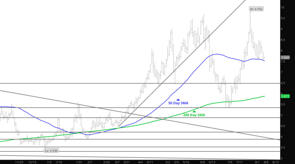 Solid test of the support that has basically held the close for the last month (50 Day SMA)– and now we need to watch what price action occurs. A break below will bring addition covering of length, likely expanding the recent range down to $7.00 ish.