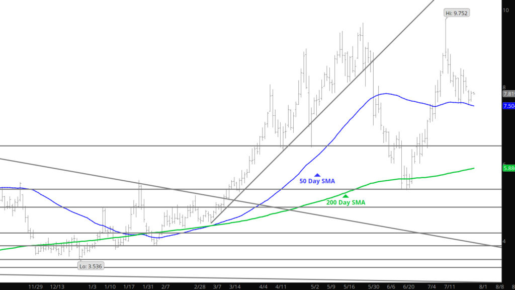 Major Support: $7.55, $7.14, $7.078, $6.88, $6.754,$6.38, $6.02, $5.623, Minor Support:$7.35, $7.41, $6.42, $5.548, $5.40-$5.45 Major Resistance: $8.95, $8.996-$9.057