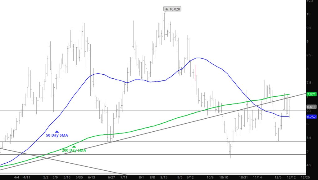 First down , then up, now this week down– lots of gapping going on. The wonderful world of trading temps and changing forecasts. That said, there is no gap in the charts as the low last Friday $6.219 and the high last night was $6.23 but there is a substantial gap from where the last trade was on Friday (guess they were expecting cold forecasts). Oh well, still in the range and just waiting for folks to play during the Holiday week. Stick to the ranges discussed for the last month or so and be sure to read the Weekly