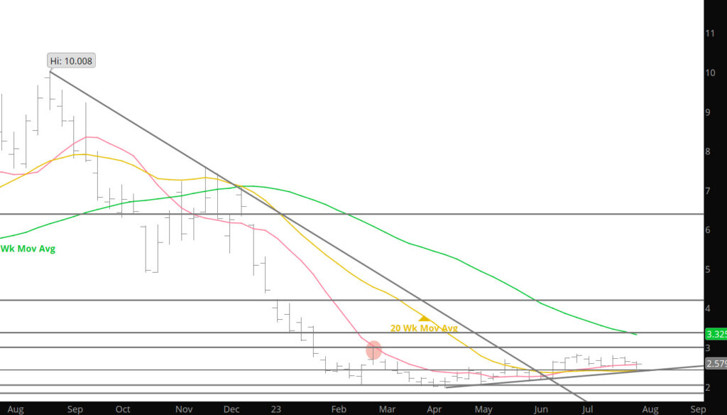 For the fourth straight week support above $2.450 limited any further decline. The last lower low was $2.448 on June 21st. The prompt did start out a little stronger (trading to a high of 2.693) after settling the previous week at $2.638 but quickly failed. For eight straight trading days prompt gas failed within the range of the last high volume day (July 20th) when a few more than 500,000 contracts traded. The high that day was $2.789. Trading highs within the range of a high volume day is characteristic of the continuing consolidation and construction of a trading range. The zone between the July high and the June high, $2.839, forms the upper boundary the recent range.