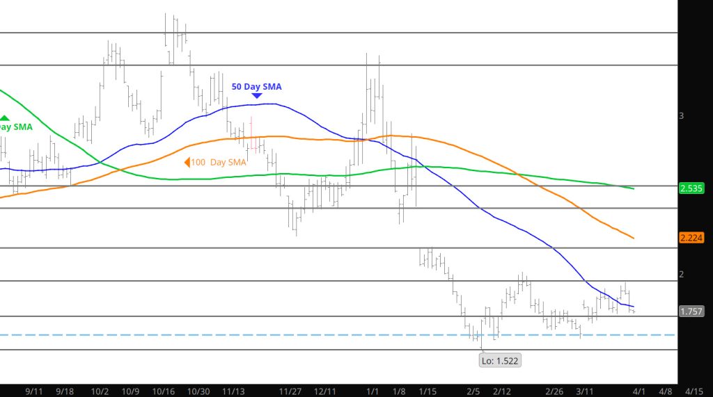 No breakage of the ceiling yesterday — instead the price run failed and prices went back into the mini-range for the May contract. Am going to be interested in the weekly momentum and internals for this week. Will discuss in the Weekly section next week.