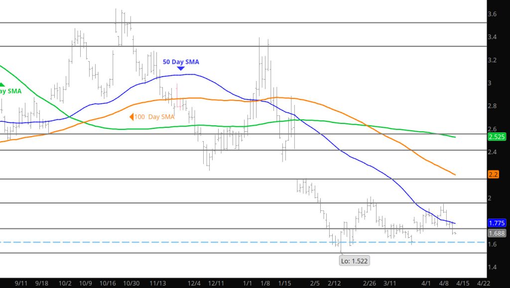 We might be finding some excitement as the prompt May contract is challenging the calendar low for the month. A breakdown may take prices to the support from the previous months expiration lows. It may also close a small gap in the Daily trade. Finally, something to discuss– no bias adjustment in this move.