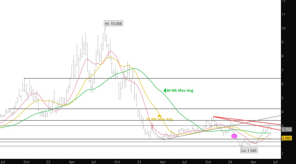 Been discussing the trend of the contract months that have expired during 2024 have been amply offered during their closing days (March, April and May traded the lows of their tenure on the day they went to settlement). February didn’t but lost $.443 (from high to low) over its last three days. June lost $.507 over its last four days as it fell from $2.924 to test the continuation 200 – day SMA. July would appear to be on a similar path. Expect expiring July to test the zone of support between +/- $2.450 and $2.640, which includes 50% and 61.8% retracement of the rally from its February low, its 50 – day SMA and the nearly flat continuation 200 – day SMA that held near the low of expiring June. A failure by July to weaken into expiration would indicate a change in the character and or bias of supply and demand for gas.