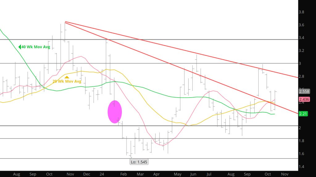 The December contract, still commands $.532 premium over November, traded an outside week reversal. Closing higher each day this week December rallied to test its 50 – day SMA, increased its premium over the expiring prompt and ended above the high traded a week ago with expected increasing volume (due to the roll). That weekly reversal and increased premium are technical positives that are likely to play an important role for calendar November and the remainder of ’24.