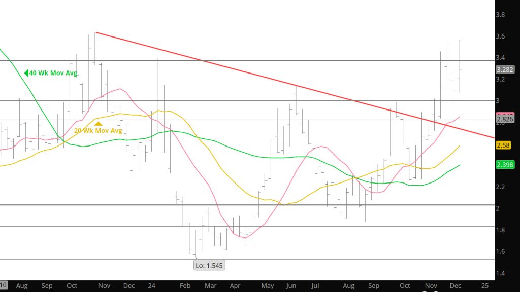 January rallied nearly$ .50/dt…where it failed again at its 40 – day SMA and just short of the November high ($3.559 v$3.563). Prompt gas traded a range of $.490 between Tuesday and Thursday with January closing $.02 above its opening for the week ($2.280 v$2.260). For the second time in three weeks that prompt gas has closed a few ticks higher than it opened, continuing the interpretation of an indication of indecision.