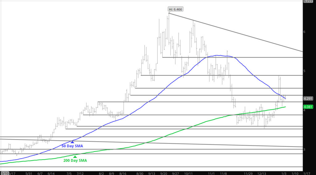 Price action rebounded off of the lows from the storage report declines, bouncing off of weak support areas and found support as the day went on. This type of bounce is likely related to some changes in the forecasts and if your desire is to trade these chops then feel free. My concept is to show patience — wait for a strong test of support between $3.70 and last week’s low $3.78 to add to positions. Go into the expiration history in the Weekly section and strongly recommend reading it.