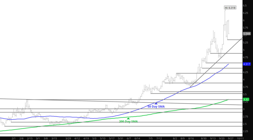 The elevated level of volatility, the reversals traded this week and previous weeks as prices traded over $6, the near weekly doji (prompt gas closed at 5.556 after opening at 5.628 and traded a new high in between) may be suggesting that Nov contract is vulnerable to a more significant retracement. Like a broken clock, I have been suggesting that the rally is overextended and due for a correction for the last month or so.
