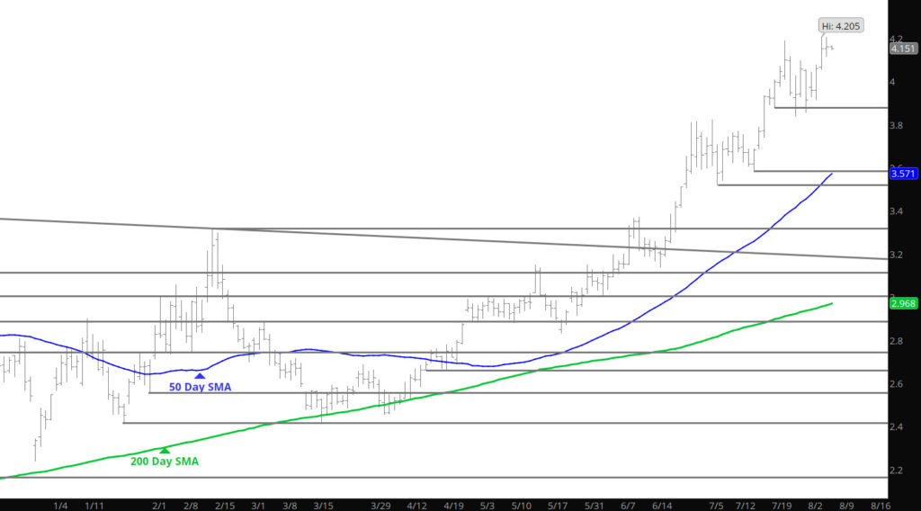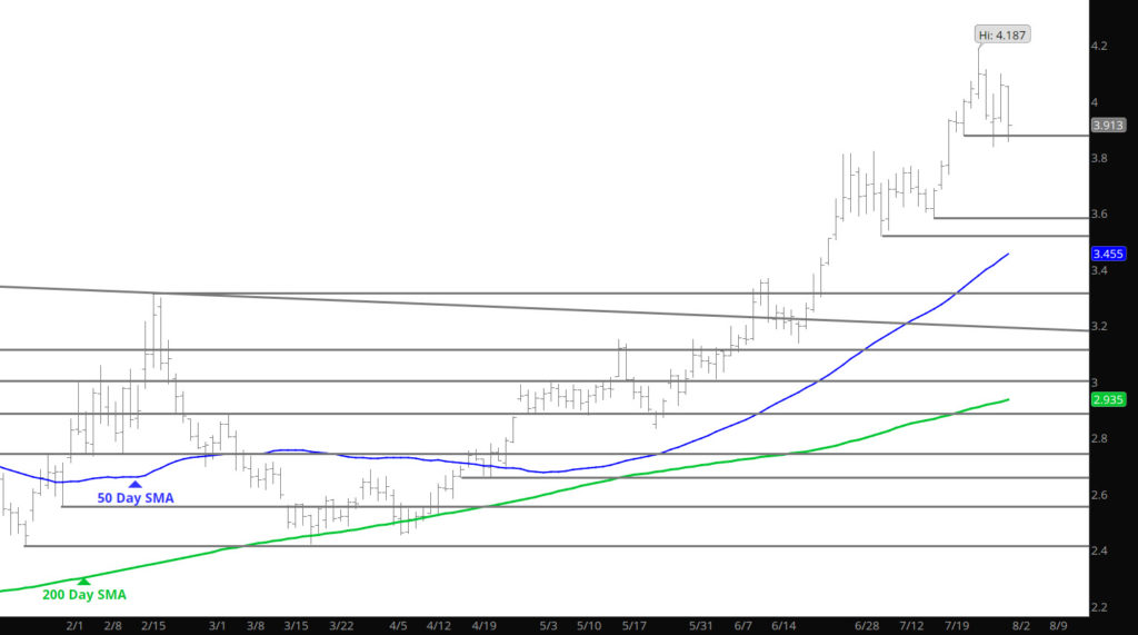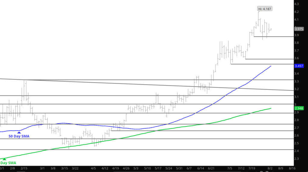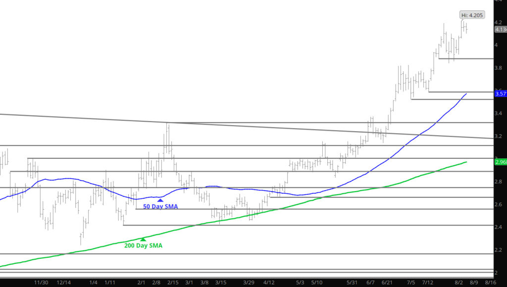 Yesterday’s run should act as a warning signal to the eager and aggressive bears as many got their eyelids ripped off during the run. This trader is waiting for a more definitive move by the market before trying to catch a rocket ship. Am still expecting additional consolidation but now there are some doubts creeping into my expectations of a test of major support down to or below $3.75-$3.70 during the seasonal declines. The market will decide.