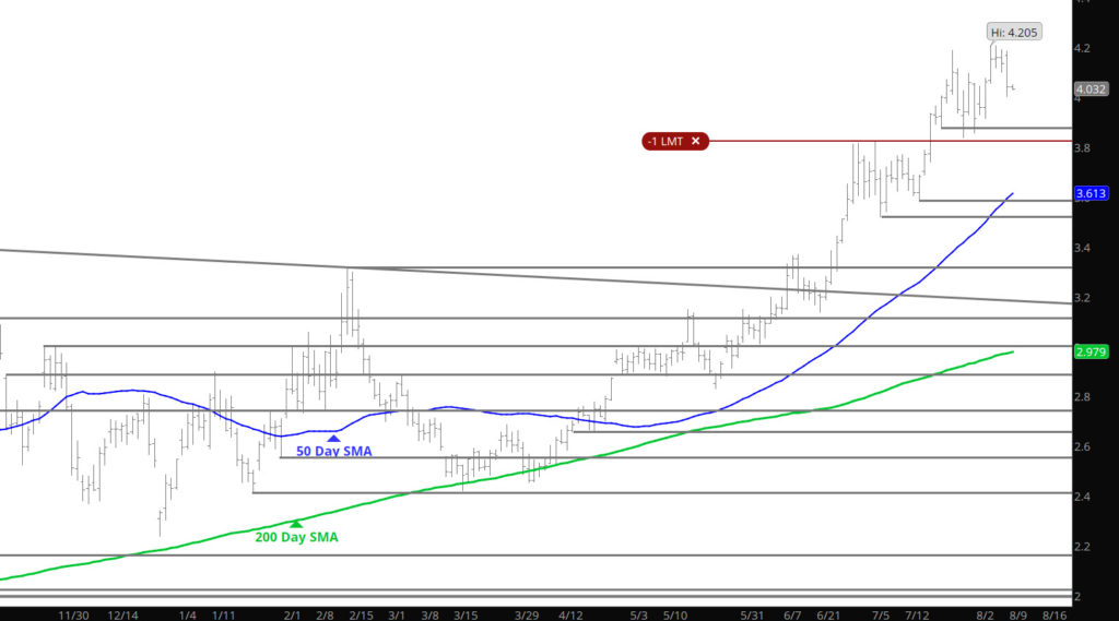 Unlike Monday’s action, prices held the early strength closing just off the highs. The run questions my comment yesterday defining the high end of the range, perhaps we need to test the highs from last week or the highs for Sep contract from last week ($4.165).