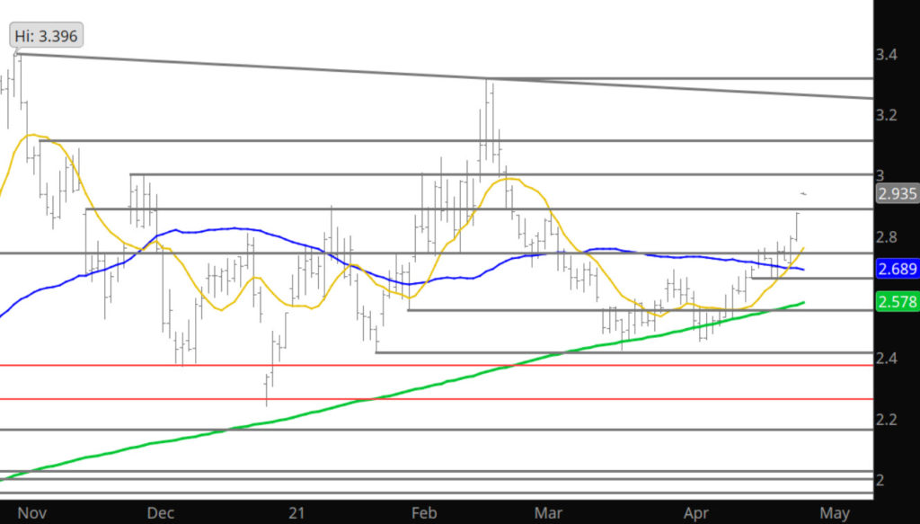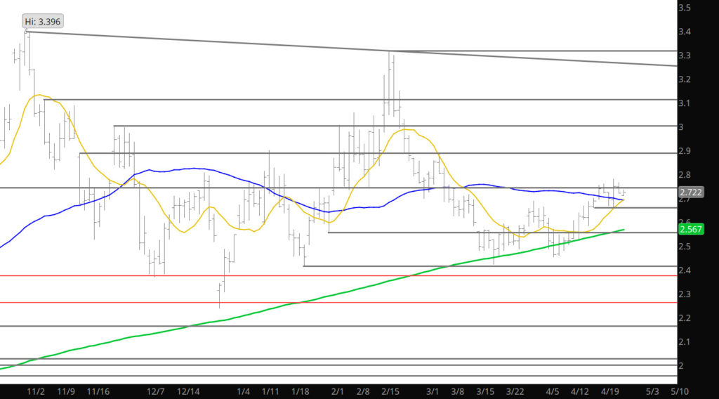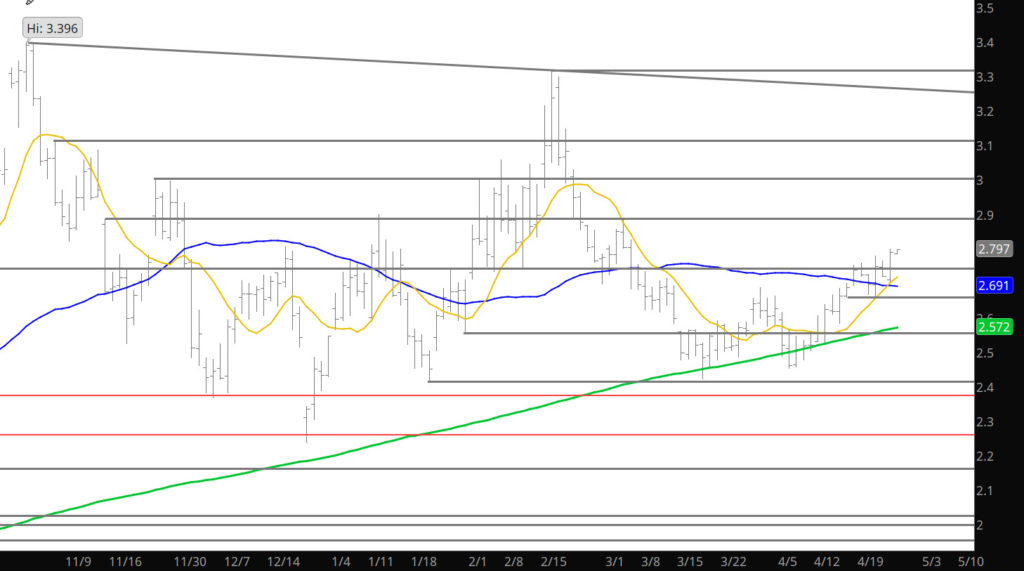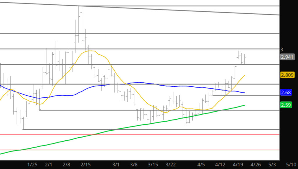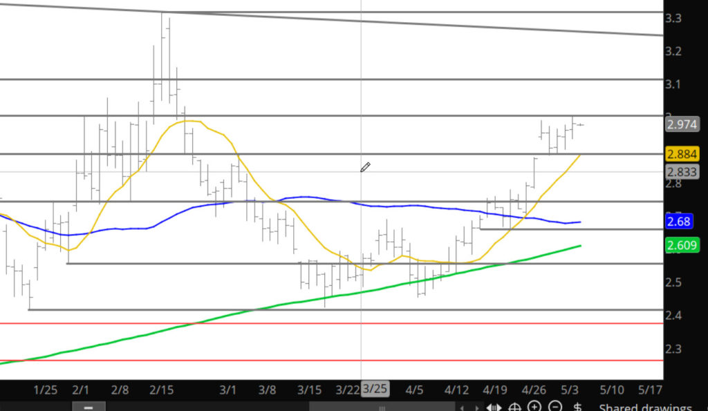 Didn’t surprise me that the contract expired near the highs yesterday (which turned out to be the third highest daily close for the May contract in over a year) as this market is continue to show strong bias. Been hearing little from my fundamental trading folks, indicating that they too are befuddled by the action. Now is the key time for the June contract — would prefer a brief pull back and re-define the support areas before accosting the $3.00 zone — but my preferences are truly irrelevant. From a technical perspective — a brief period of consolidation is warranted.