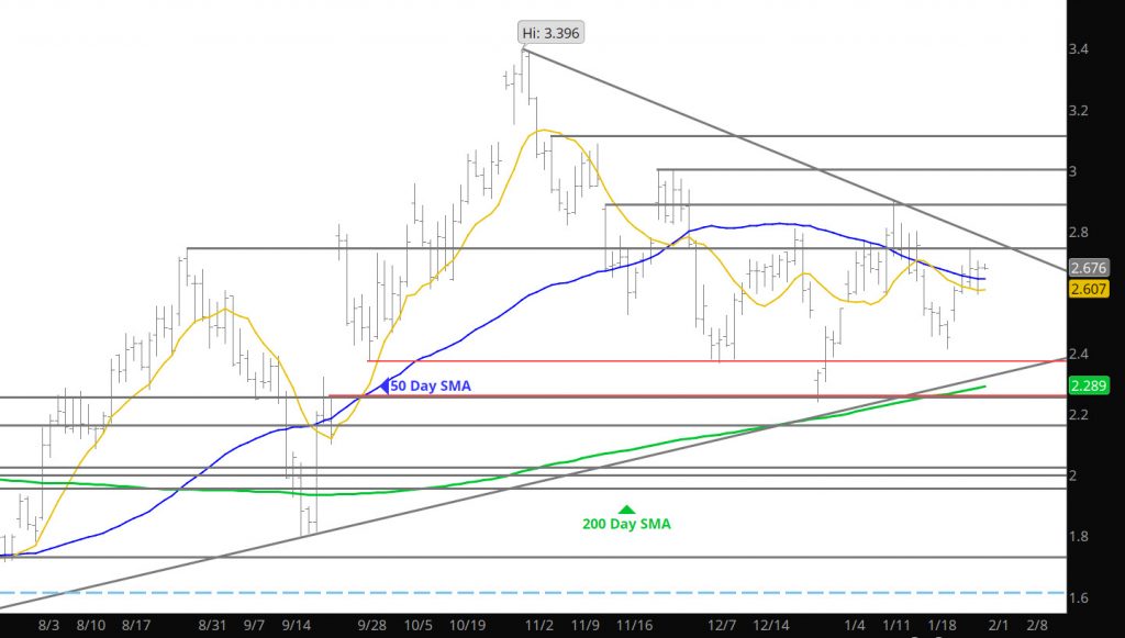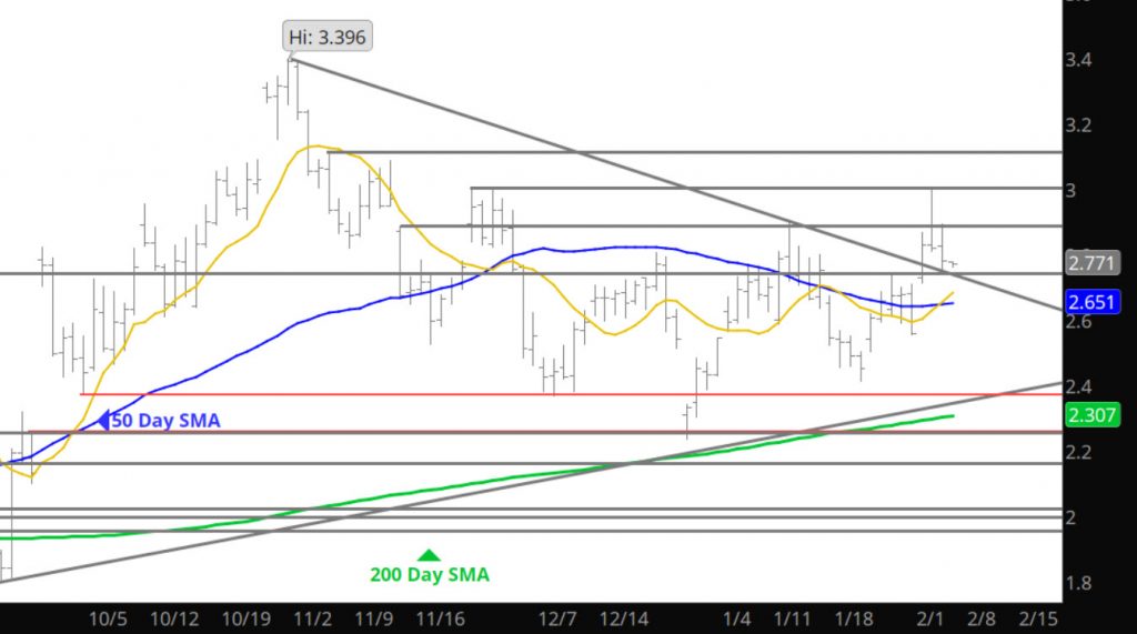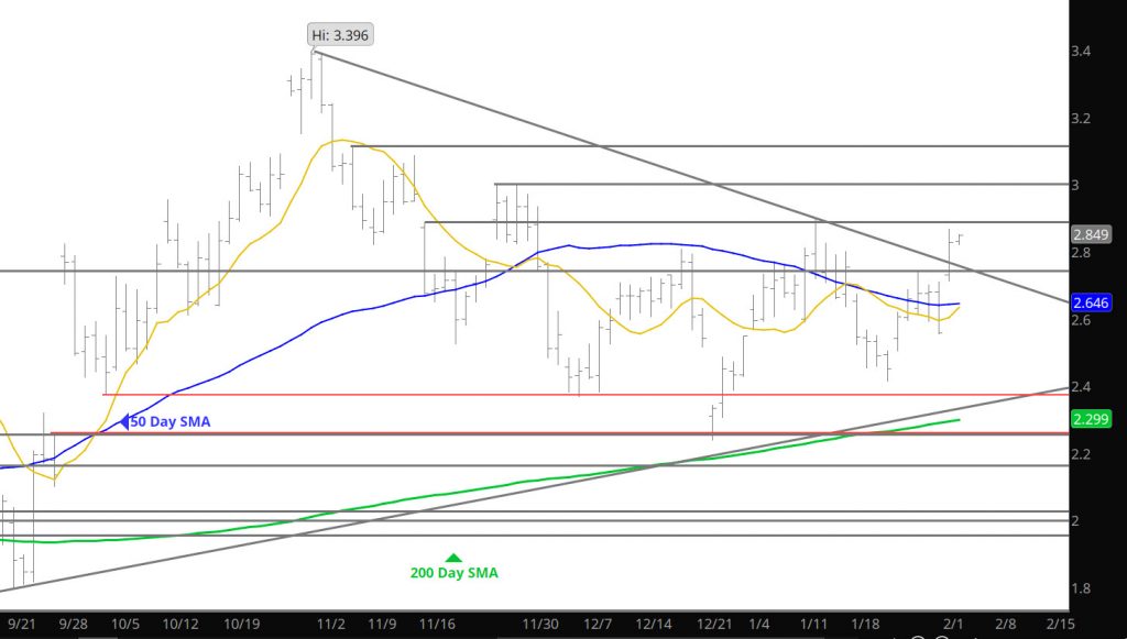 Not much to report on yesterday’s action with prices staying close to the opening after a brief run to $2.985. This is an interesting trade as the weather forecasts are showing frigid cold coming (so I have heard) and extending longer in time than folks thought, yet prices are relatively calm. This frigid February may take the storage surplus (over the 5 year average) out to the wood shed. Again, I have no idea how you fundamental folks trade, but I have to believe that prices have not baked in the results of the upcoming period of weather.