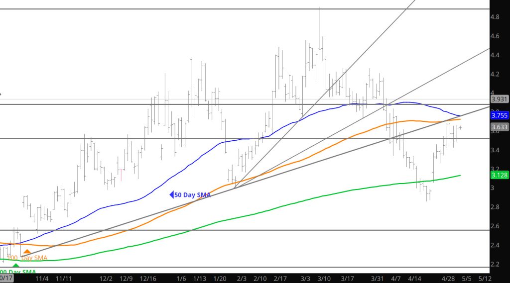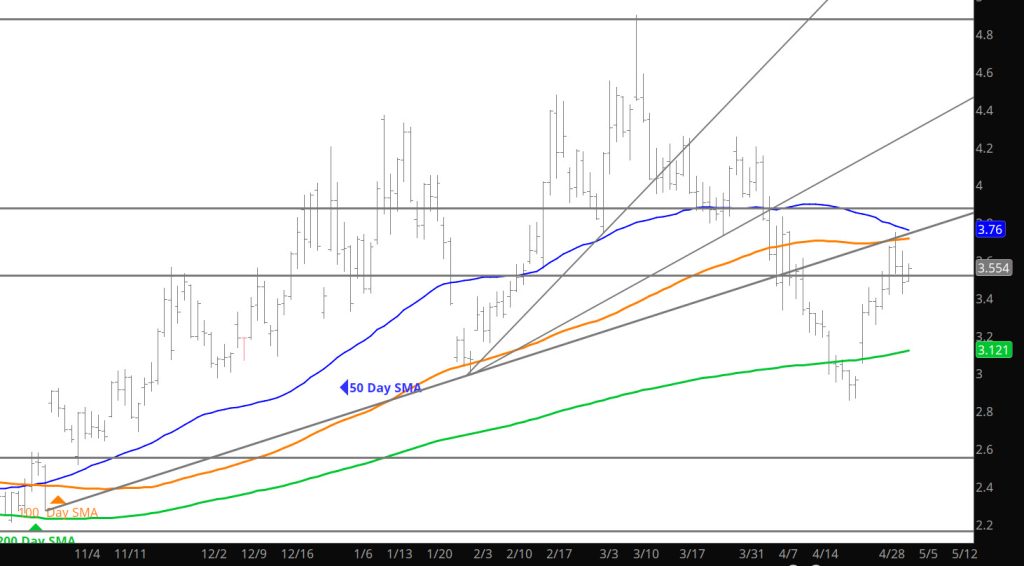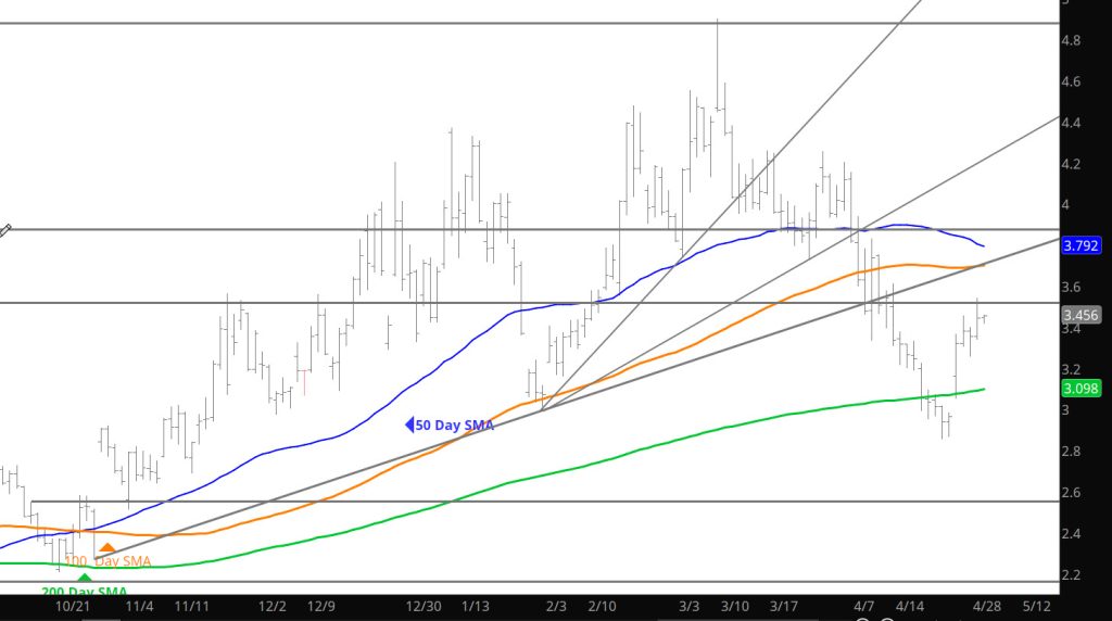 Last week’s rally was not among the things was not my immediate expectation. My view was that new prompt May would forfeit its premium and prompt gas offered lower to test rising trend line support and that technical “damage” done by the precipitous decline during calendar April (from a high on 04/03 at $4.203 to a 4/24 low at $2.858) including a weekly close below the December and January lows ($2.977 – $2.990) would render a significant recovery problematic at best.