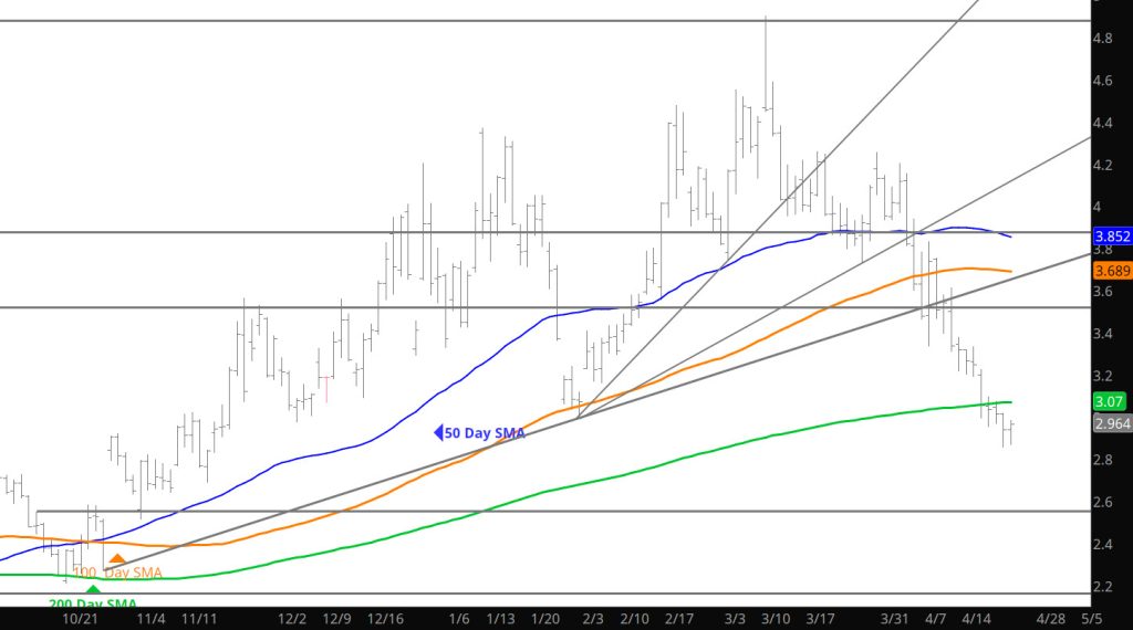 The trade low from yesterday was below the low from earlier in the year as prices fell below $2.99 for a few trades. The question now is how low with the bears take the market. Similar to 2020, the Q1 low was briefly broken in April before prices rebounded. Not convinced the market signals are the same a 2020 as we were going through an over supplied bias then. Six consecutive down trading days is starting to leave some over sold indicators. Selling should carry tight stops.