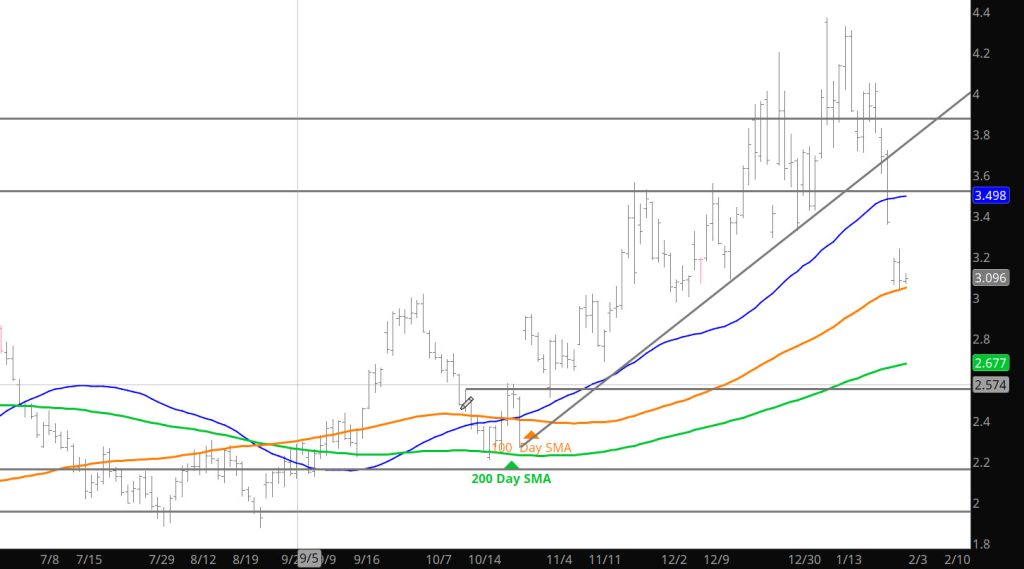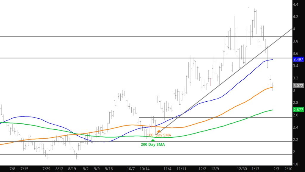 As discussed previously, March has a consistent historical tendency of trading either the high or low of its tenure as prompt by the end of its first full week. Last week I wrote to expect the expiration gap to be filled sooner rather than later and for the high of March’s tenure to be traded during the coming week . The gap was closed and March traded to a high of $2.435 before fading into the close. That recovery high, 38.2% retracement of the continuation decline from the 01/13 high and the 50 – day SMA both of which are +/- $3.500 will present substantial resistance. In the, unlikely event that March is able to trade a higher high then another test of $3 may not be in the cards, but my guess is that a violation of a rising short term trend line, will lead to that test of the December and January lows. I think that March will be offered lower.