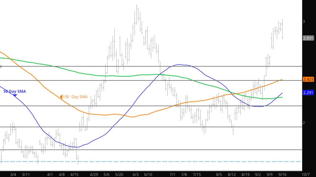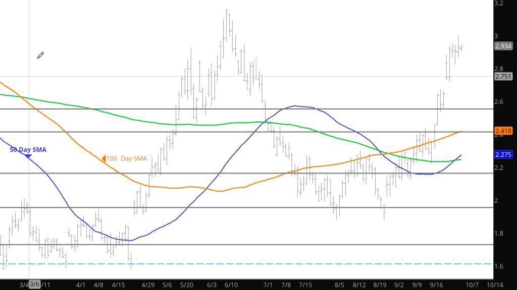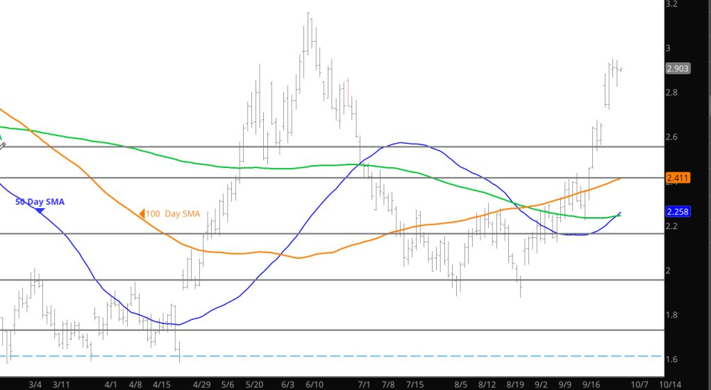 The market failed at resistance and now wants to challenge the support side of the recent range between $2.58-$2.64 we shall see how much the market adds to the positions in the coming days. Keep and eye on daily volume levels over the next couple of days — lets see how many folks want to sell into Nov prices this early in the month.