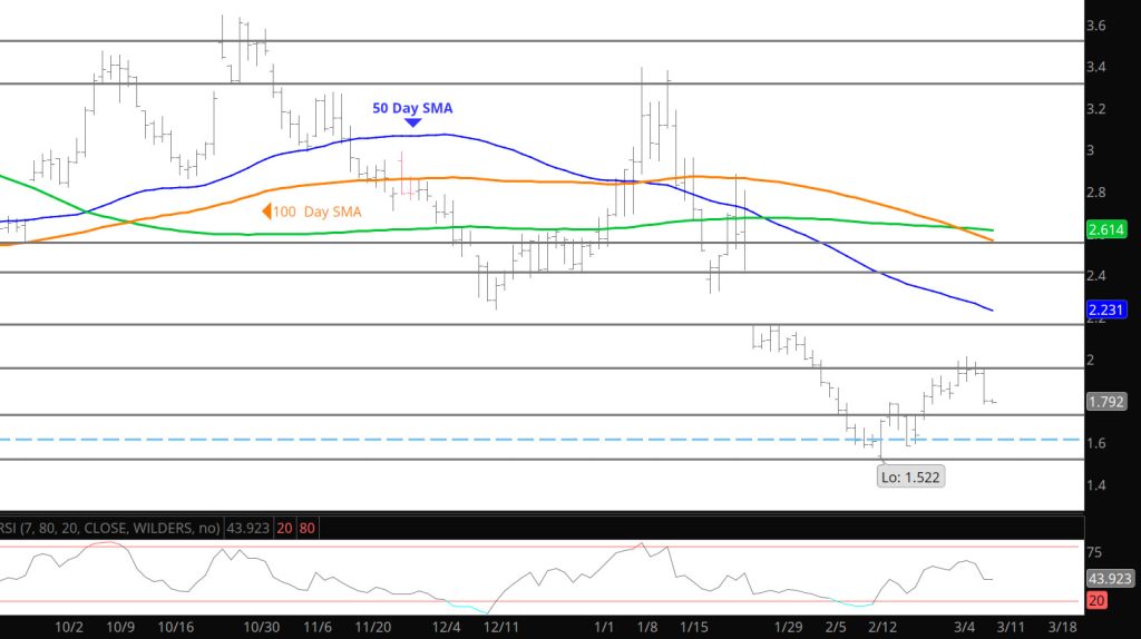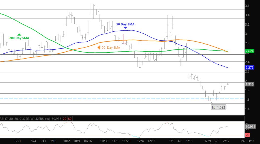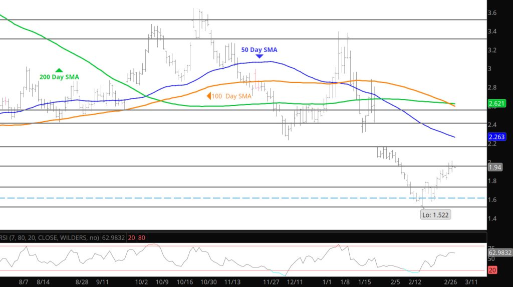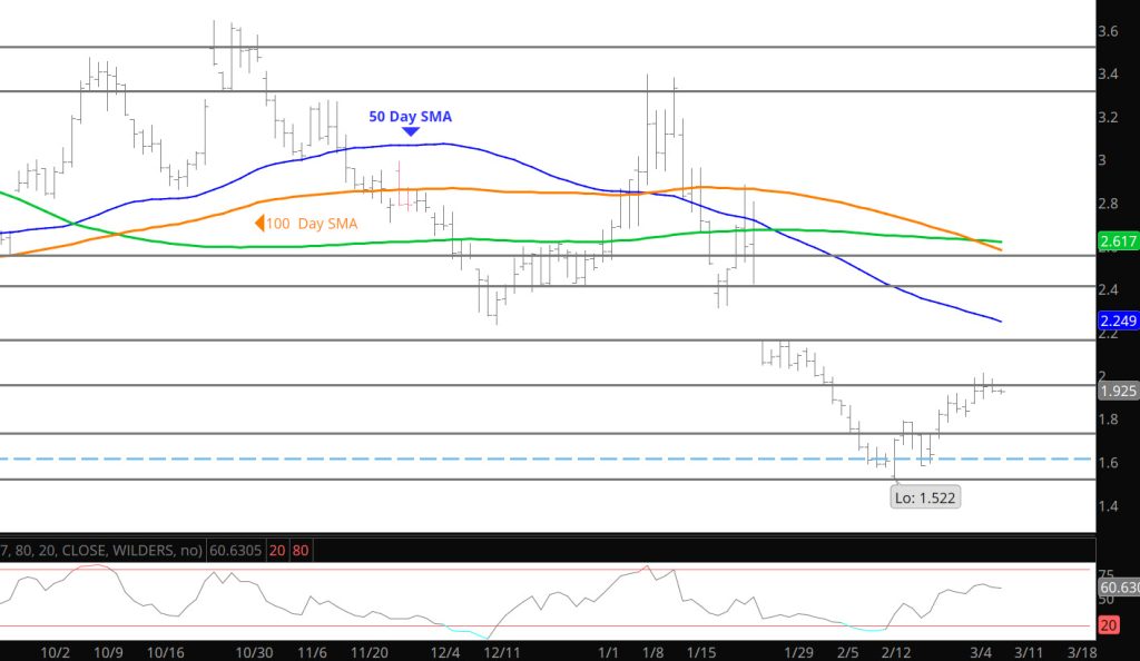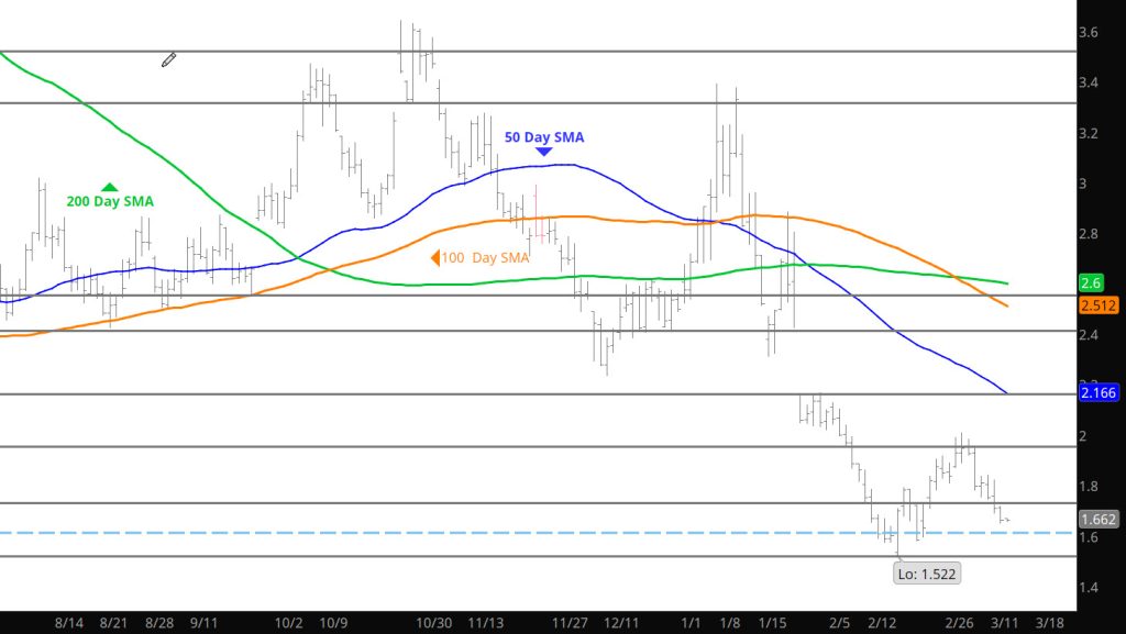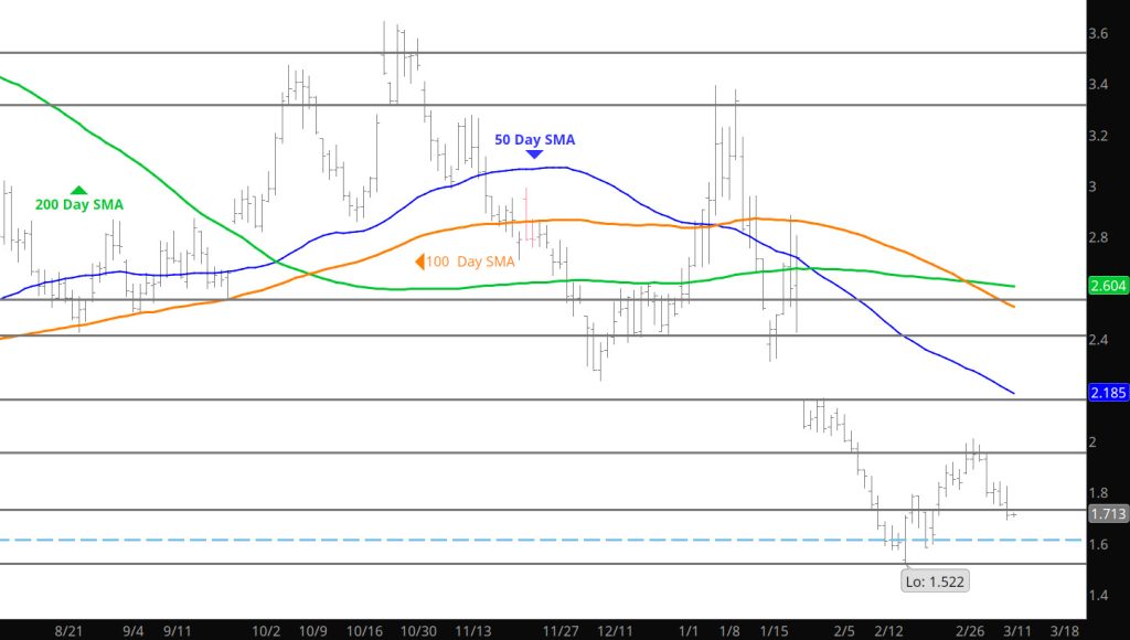 Prices never tested the key levels of support before finding buyers and gaining a dime. Perhaps we have developed another range trade and will be testing the resistance either tomorrow or next week. The market has not left the range trade of the last 5 weeks between the $1.50’s and $2.00 but prehaps the market is consolidating in a narrower range.