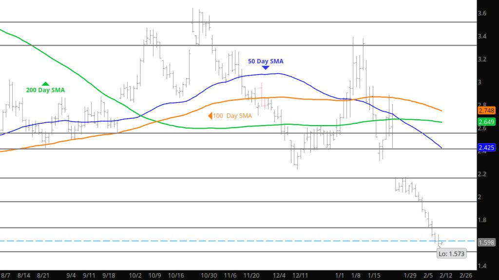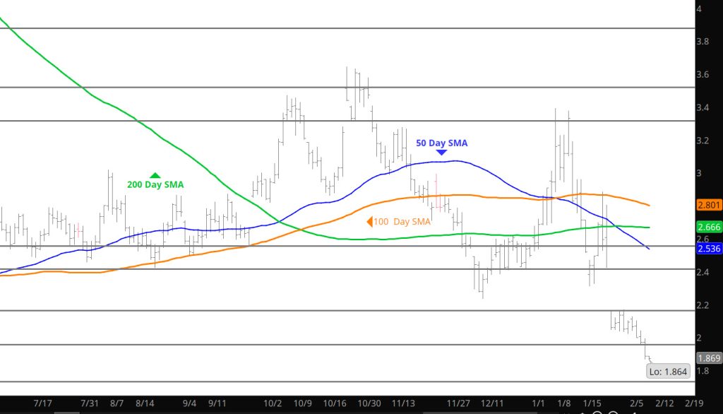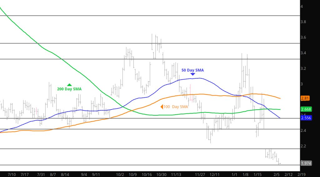 March collapsed through and closed below support presented by the February – March – April ’23 lows. Friday’s close was the lowest since July ’20. March reversed from $2.127 and five straight lower closes I thought that prices would hold the support zones and form the construction of a trading range that would support a historically consistent Q2 rally. From that support there would be a annual Q2 rally which is still expected but the late winter/spring rally, will certainly commence from a lower price than expected, and likely be less than average (the ten years average is about 50%). You should also expect that the rally will be primarily be powered by short covering.